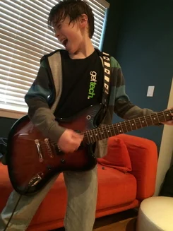 My oldest, Maxon, takes guitar lessons and is in the band program at Bluebond Guitars and Music School in Queen Village. In his most recent lesson, held on the second floor of the music store, he made up his own song with his teacher accompanying him on drums. When he came downstairs, he gave me a sample of his new oeuvre.